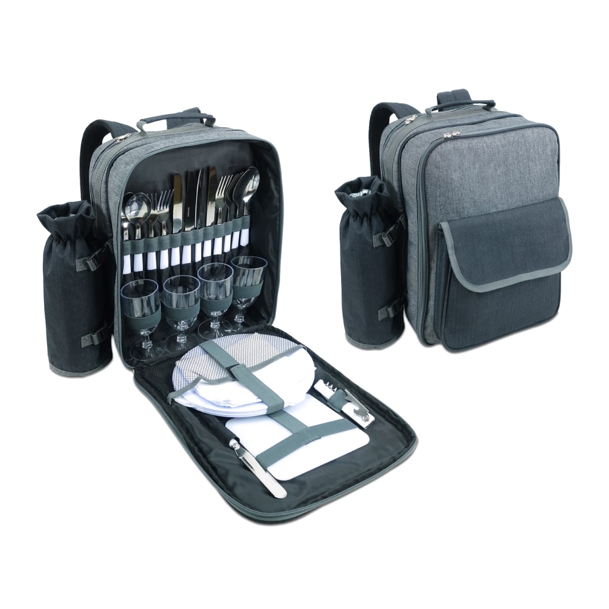 תיק גב משולב צידנית מבודדת לשמירה על חום/קור עם סט פיקניק יוקרתי ל-4 סועדים. כולל תא מבודד נפרד לבקבוק, עשוי מאריג איכותי במיוחד. מתאים לפיק