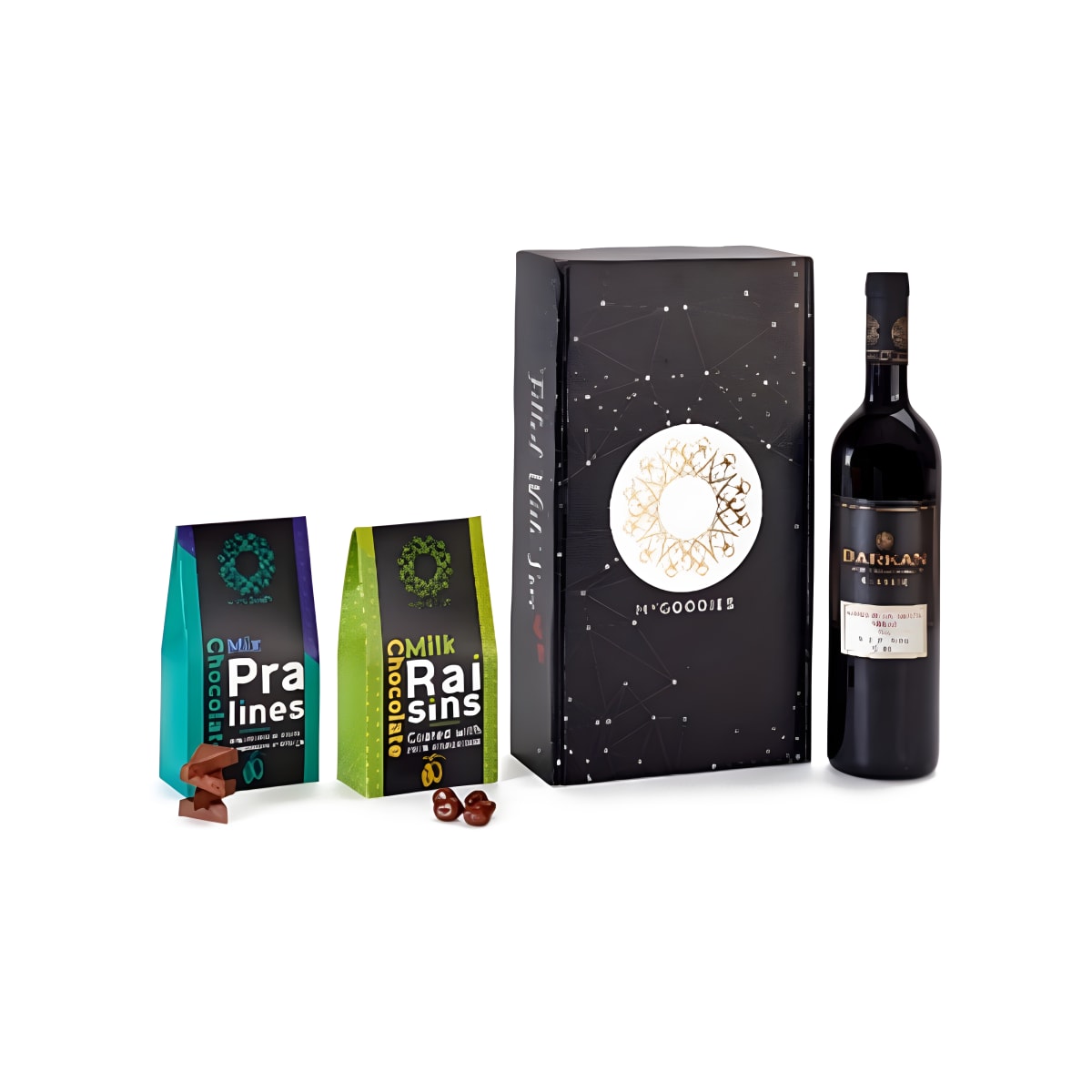 הענק לאירוע המיוחד שלך עם חבילה יוקרתית הכוללת יין אדום מרלו שיראז מסדרת Barkan Classic. החבילה כוללת פרלינים ממולאים כמו קרם קקאו, קרם קפה, קרמל, אגוזי לוז ווניל לצד צימוקים מצופים בשוקולד חלב.
