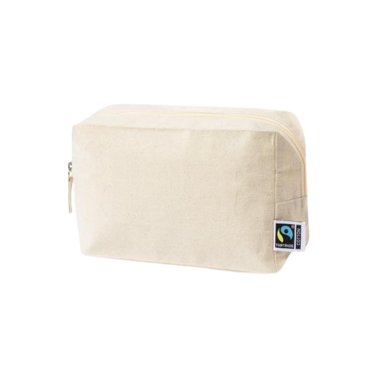 Discover our unique beauty bag made of 180g/m2 cotton in a natural tone. Certified by Fairtrade, offering an alternative to conventional trade systems, supporting community development and poverty reduction. Features a main compartment with a zipper closure and matching pull, including a Fairtrade label and recycled cardboard hangtag.