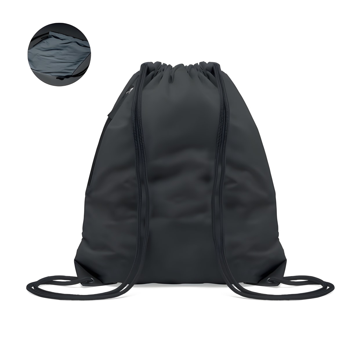 Discover our stylish drawstring bag, crafted from 190T polyester with reflective glitter coating. Features a zippered pocket on one side and