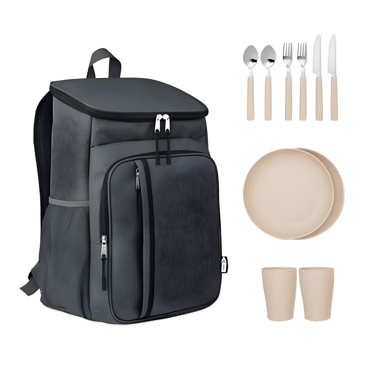 תיק גב פיקניק או תיק קירור איכותי עשוי משילוב בד 600D RPET בגוון דו-גוני. כולל אביזרי שולחן לשני אנשים: סכין נירוסטה, מזלג, כף וכוס PP. המוצ